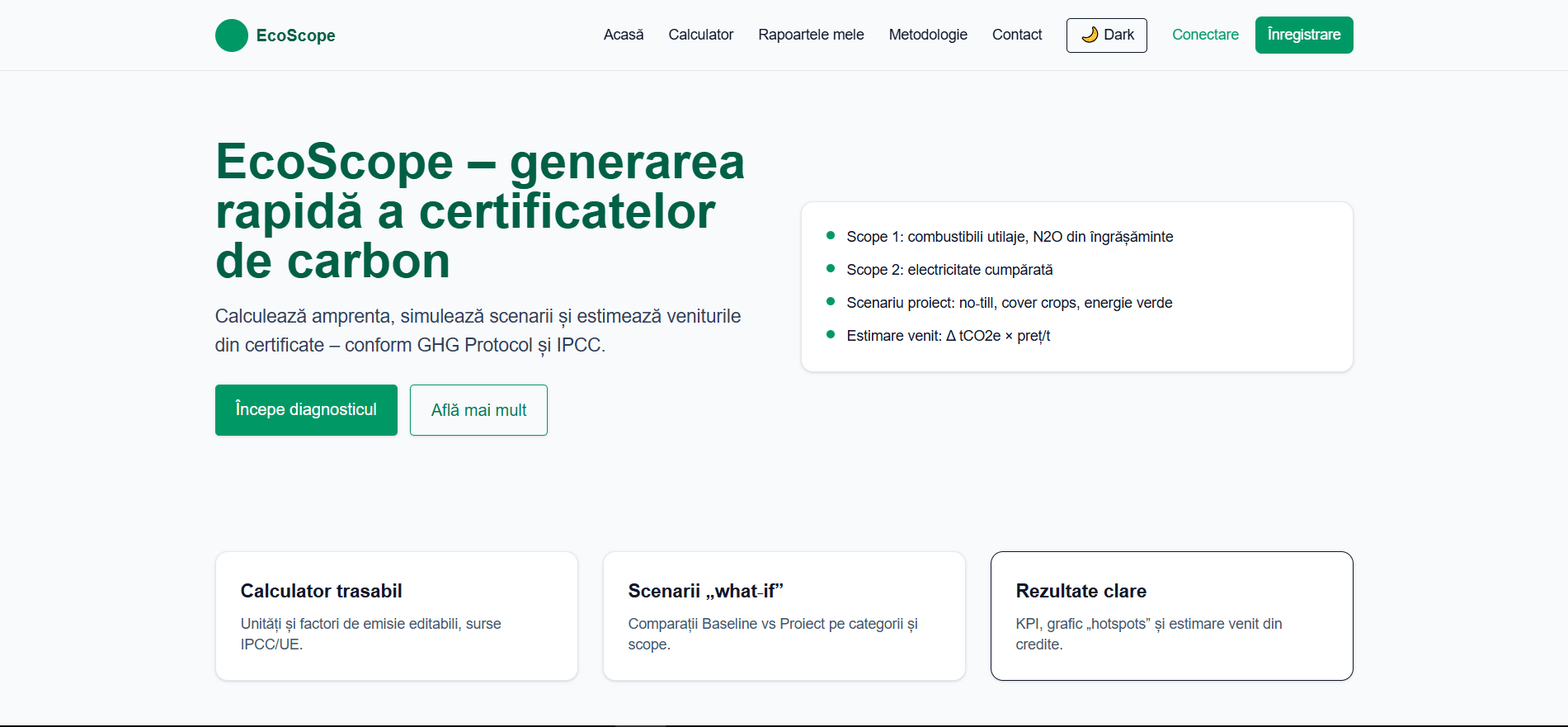 Platformă modernă pentru calcularea amprentei de carbon în agricultură, dezvoltată pentru Academia de Studii Economice din București (ASE) în cadrul Proiectului ADER 19.1.2 - 'Cercetări privind identificarea amprentei de carbon a fermelor în contextul Pactului Ecologic European și digitalizării'. Conform GHG Protocol și IPCC, permite generarea rapidă a certificatelor de carbon, simularea scenariilor și estimarea veniturilor din certificate.